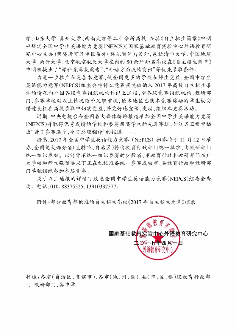 全国中学生英语能力竞赛(NEPCS)获奖被纳入2017年高校自主招生条件情况的通报